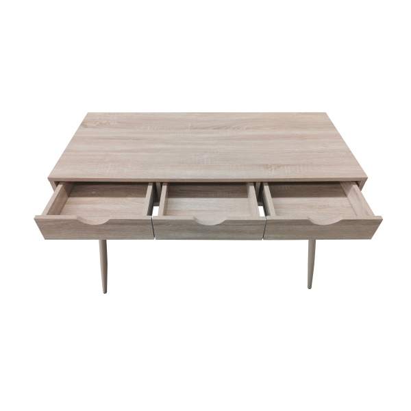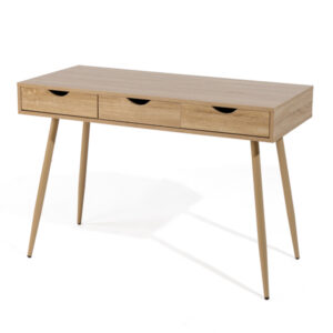 Mesa escritorio fabricada en MDF color natural, con 3 cajones en melamina del mismo color y patas metálicas pintada imitación madera. Se sirve totalmente desmontada en un bulto.
