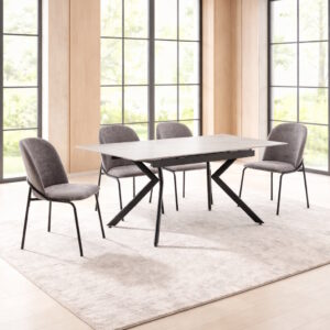 Mesa de comedor extensible con tapa de piedra sinterizada sobre DM disponible en dos acabados: imitación mármol carrara con estructura de patas metálica en color negro, o imitación madera con estructura de patas metálica en color blanco. Sistema de apertura automática con extensible central.