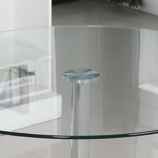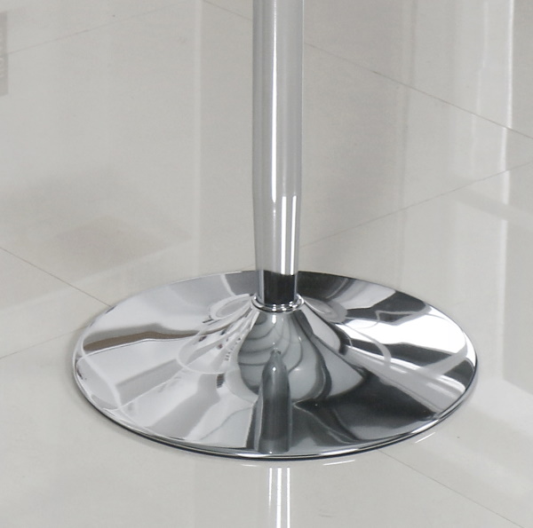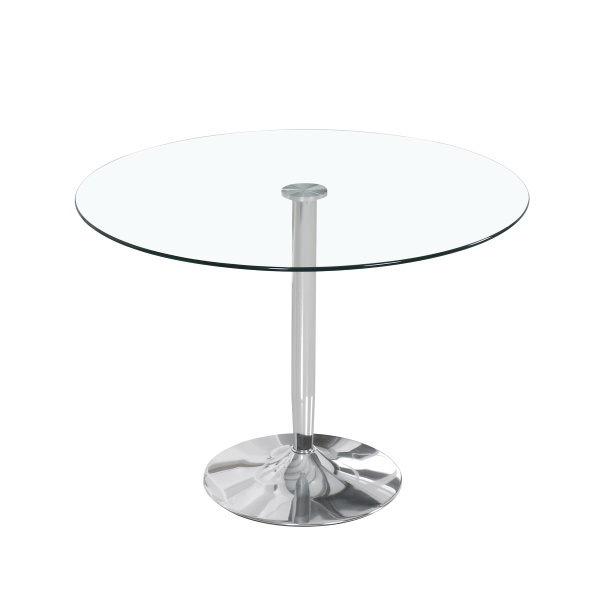 Mesa de comedor fija con tapa redonda en cristal templado de 8 mm. de espesor y pata con pie central metálica acabada en cromo. Ideal para espacios reducidos. Se sirve desmontada en tres bultos.