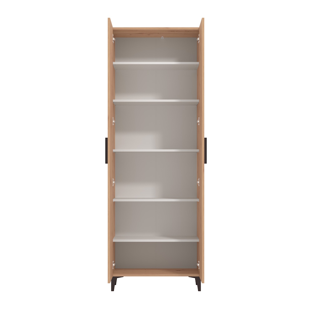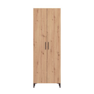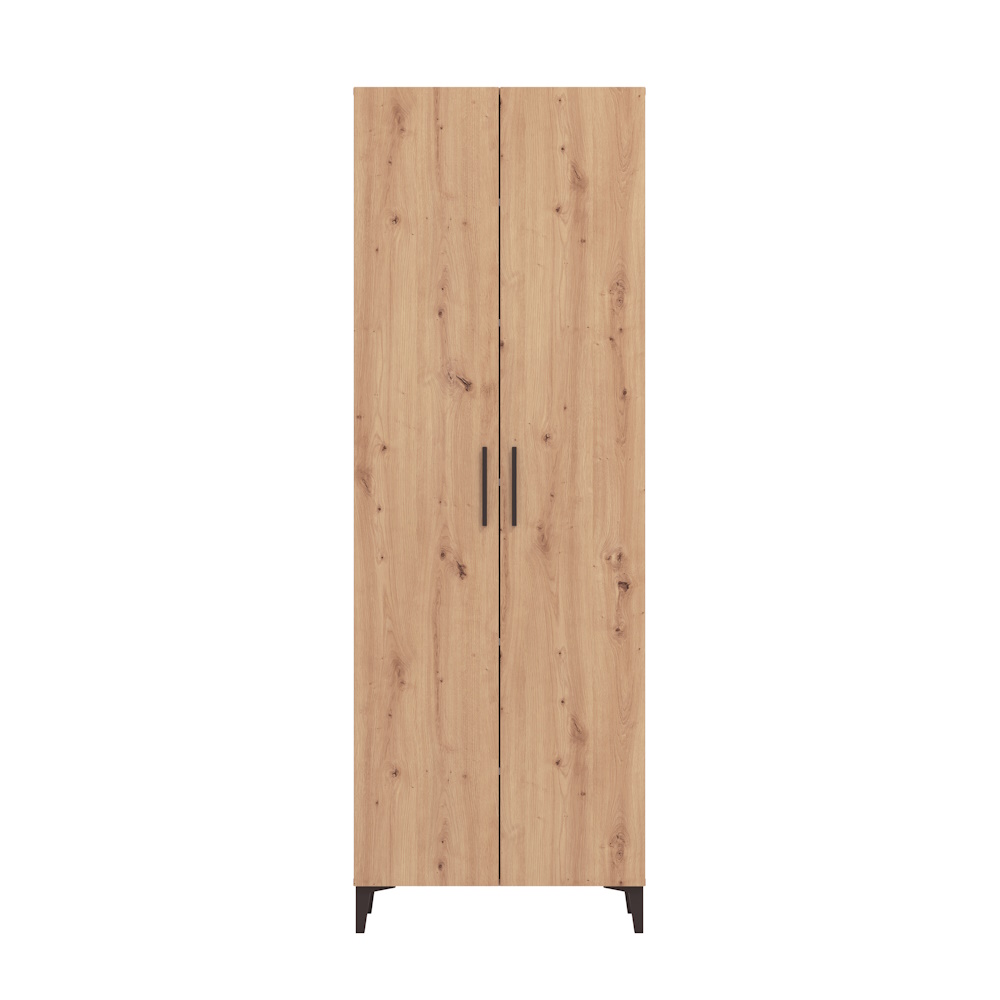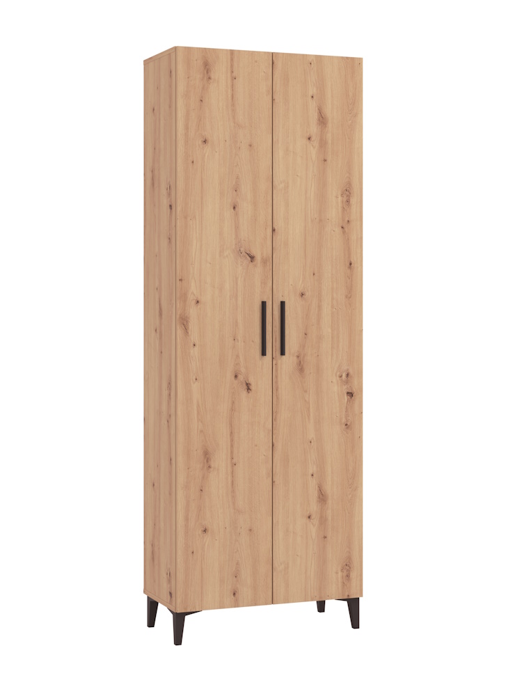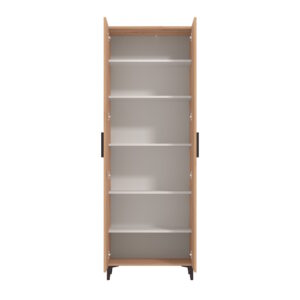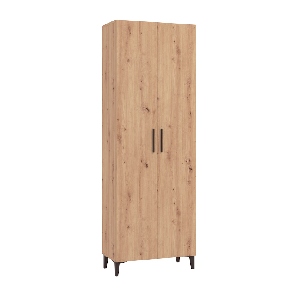 Mueble zapatero 2 puertas fabricado en laminado sintético color roble artisán en exterior y blanco en interior. Dispone de tiradores y patas altas en color negro y 5 baldas regulables en el interior. Se sirve totalmente desmontado en 2 bultos.