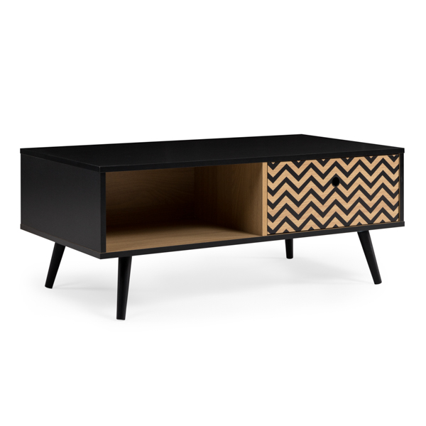 Mesa de centro fabricada en MDF con estructura en color negro y frente con grabado  de motivo geométrico combinado en roble y negro.  Lleva un cajón con tirador agujero y hueco por un lado, un hueco amplio por el otro y patas de madera en acabado negro. Se sirve totalmente desmontado en un bulto.  Medidas: 100*50*40 cm.