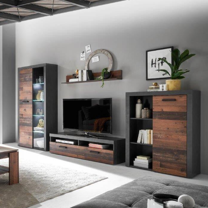 Composición de salón fabricada en MDF con laminado sintético, estructura en acabado color cemento y frentes imitación madera reciclada en tonos anogalados.  Tiradores de PVC en acabado metálico envejecido. Se compone de vitrina alta, vitrina baja, mueble TV y estante de pared. Servicio en cinco bultos tipo kit.   A juego con aparador, mesa de centro y mesa de comedor Jon. Medidas totales: 340*190*40 cm.
