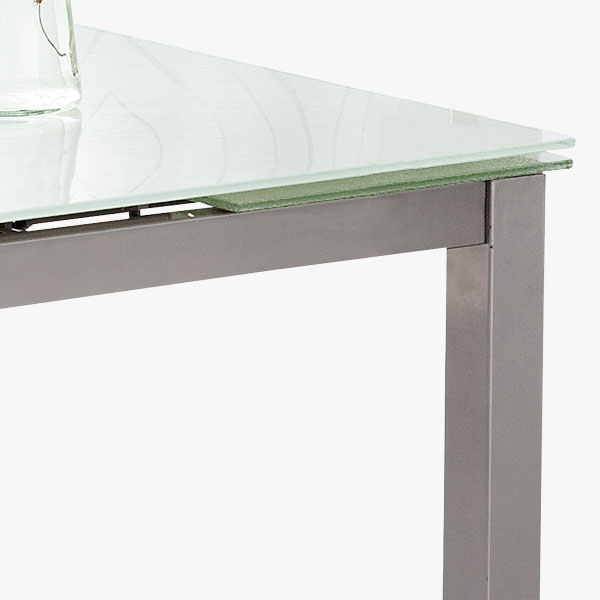 Mesa de cocina con alas extensibles, estructura metálica y cristal blanco con marca láser a la vista.  Medidas: 110/170*70*75 cm.