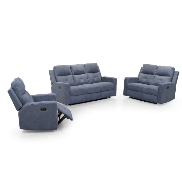 Sofá 3 plazas tapizado en tela gris azulado o marrón oscuro, con 2 relax manuales a ambos extremos y módulo central fijo, muelles en asientos, fibra en respaldos y patas metálicas en color negro.