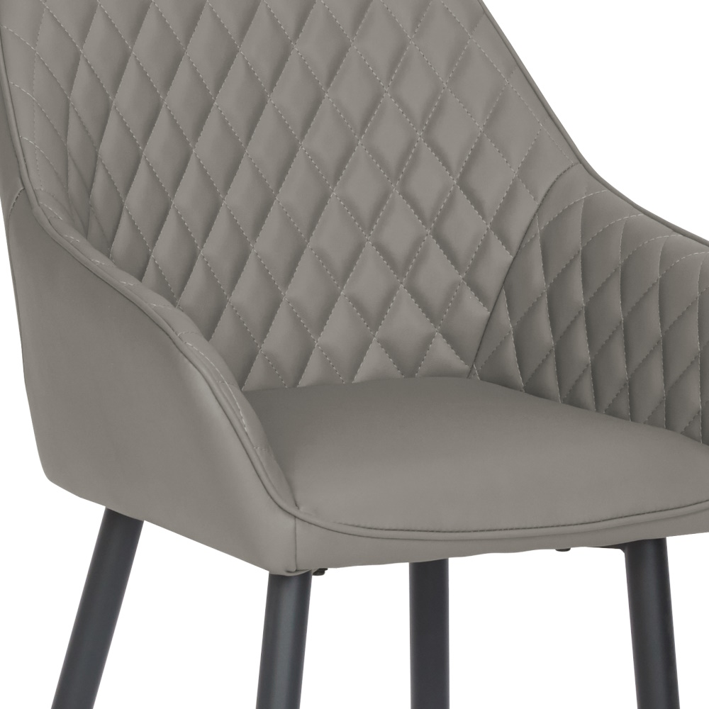 Taburete alto tapizado en PU gris con brazos y capitoné a rombos en el frente, y patas metálicas con reposapiés en color negro. Se sirve en cajas de 2 unidades.